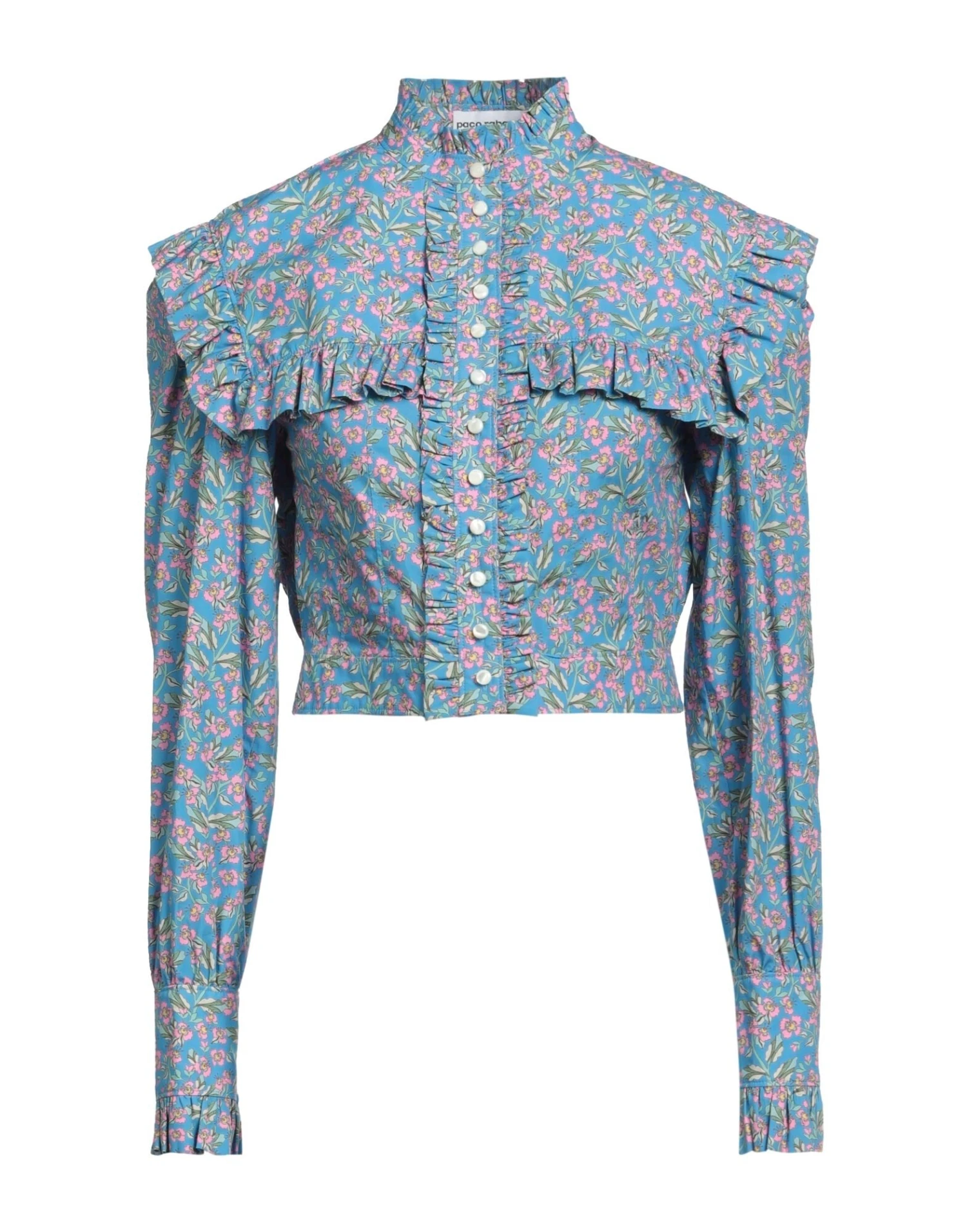 plain weave, frills, floral design, round collar, long sleeves, button closing, no pockets, small sized