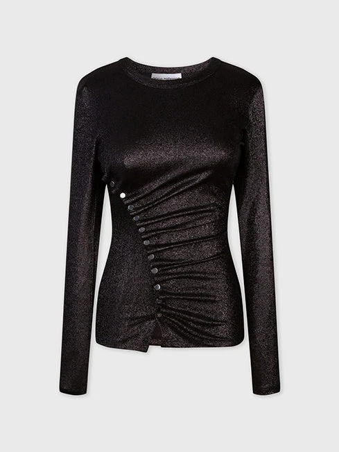 This timeless top exemplifies the Rabanne aesthetic. It has long sleeves and a fitted cut, and is crafted from black Lurex jersey. It opens on the sides with a series of silver snaps that create and elegant pleat. It can be worn effortlessly alone or open and layered over another piece. Material: 75% viscose, 20% polye