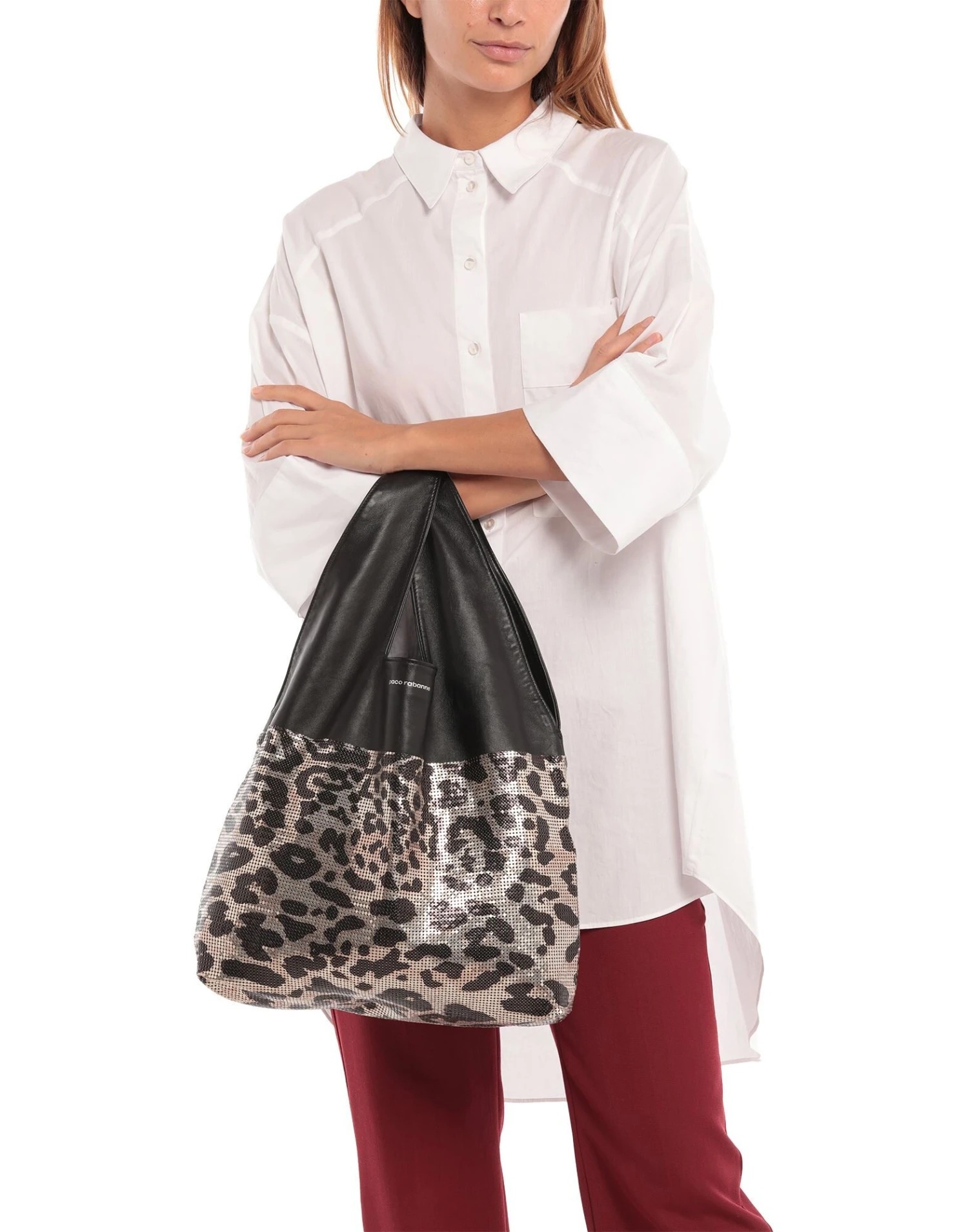 medium, detachable application, metal applications, leopard-print, bag handle, leather lining, internal pockets, contains non-textile parts of animal origin