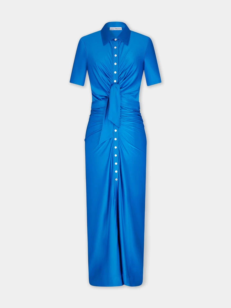 Blue stretch jersey long dress Shirt collar Short sleeves Fitted cut Tied at the waist Silver snaps on the front