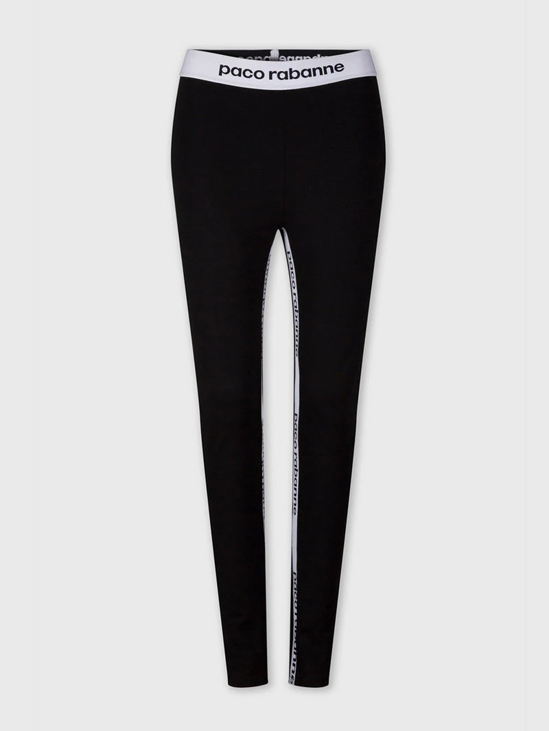 Made in slim fit black stretch jersey, these Bodyline leggings stand out thanks to the stylish white elastic strip at the waist and on the inside of the leg printed with the Paco Rabanne logo. Comfortable black leggings with prominent branding for a blend of practicality and fashion appeal.