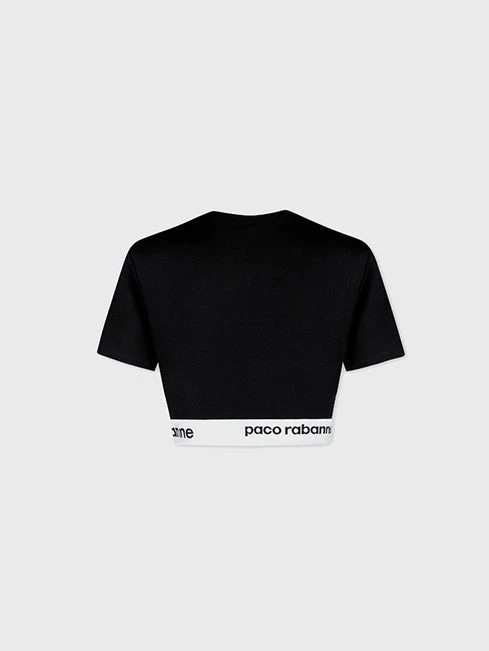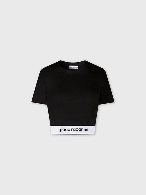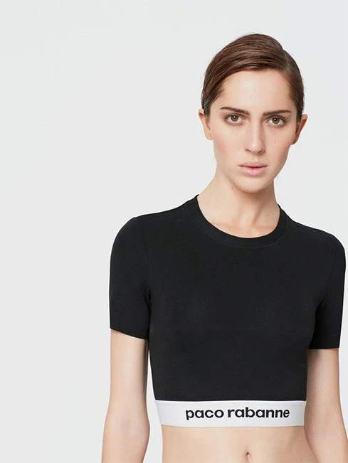 Constructed from snugly fitting stretch jersey, this black crop top from the Bodyline range features a crew neck and short sleeves. Its clean, graphic style is rounded out with a black elasticated strip printed with the Paco Rabanne logo. A comfortable crop top from Paco Rabanne for a sporty look.