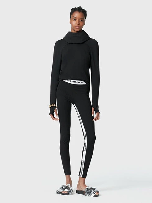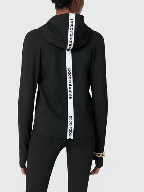 This stylish hooded sweatshirt is crafted from black stretch jersey for freedom of movement and features a Paco Rabanne white elastic strip along the back as an eye-catching visual accent. A black sweatshirt from the Bodyline collection, comfortable for wearing to the gym or out and about.