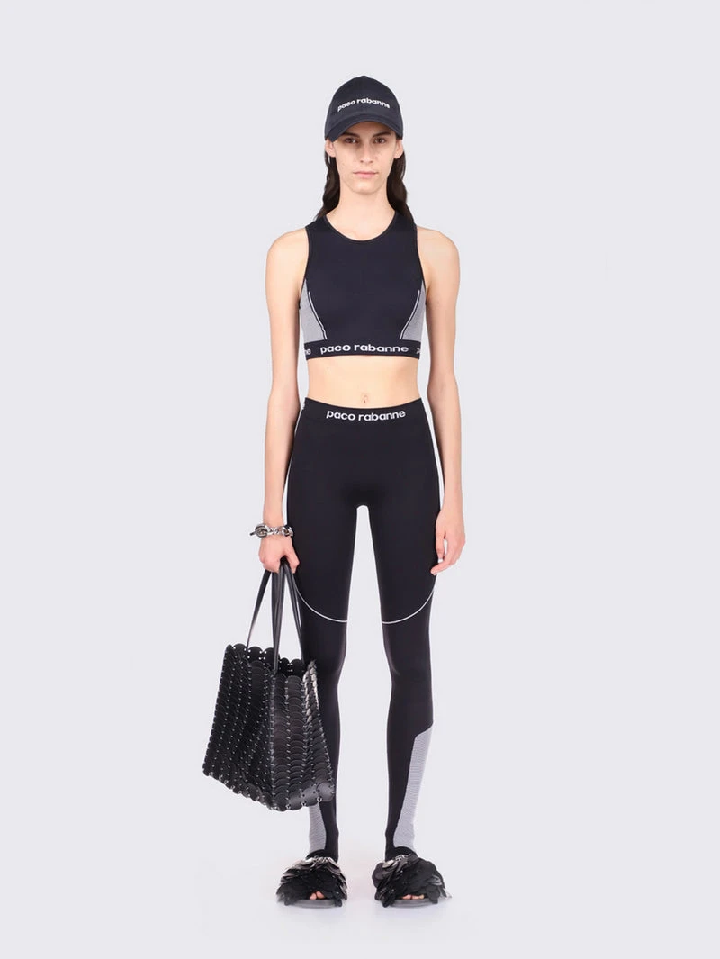 Made in black and grey sheathing jersey, this Bodyline bra adopts a short tank top shape. It is maintained by an elastic band signed Paco Rabanne. A very comfortable bra.