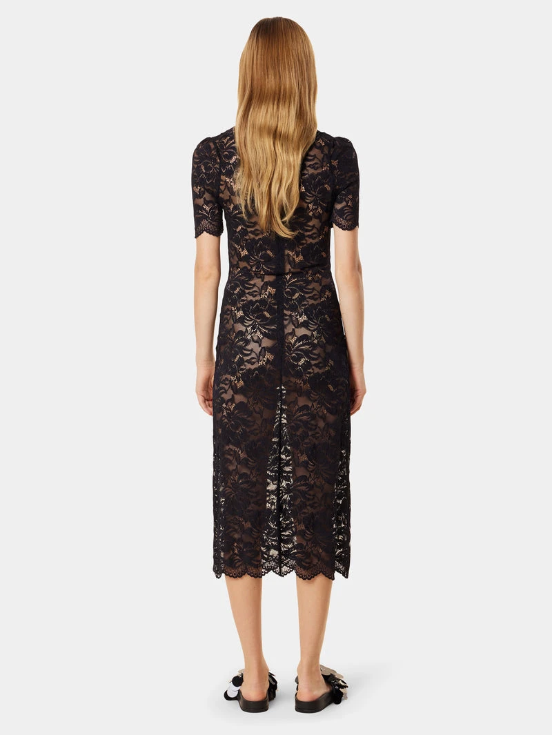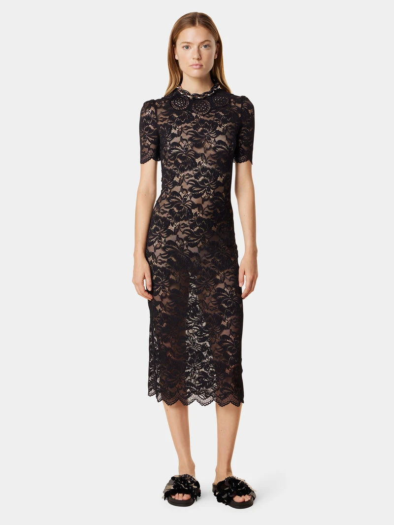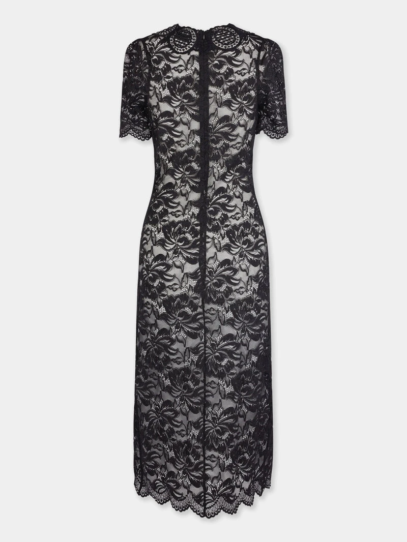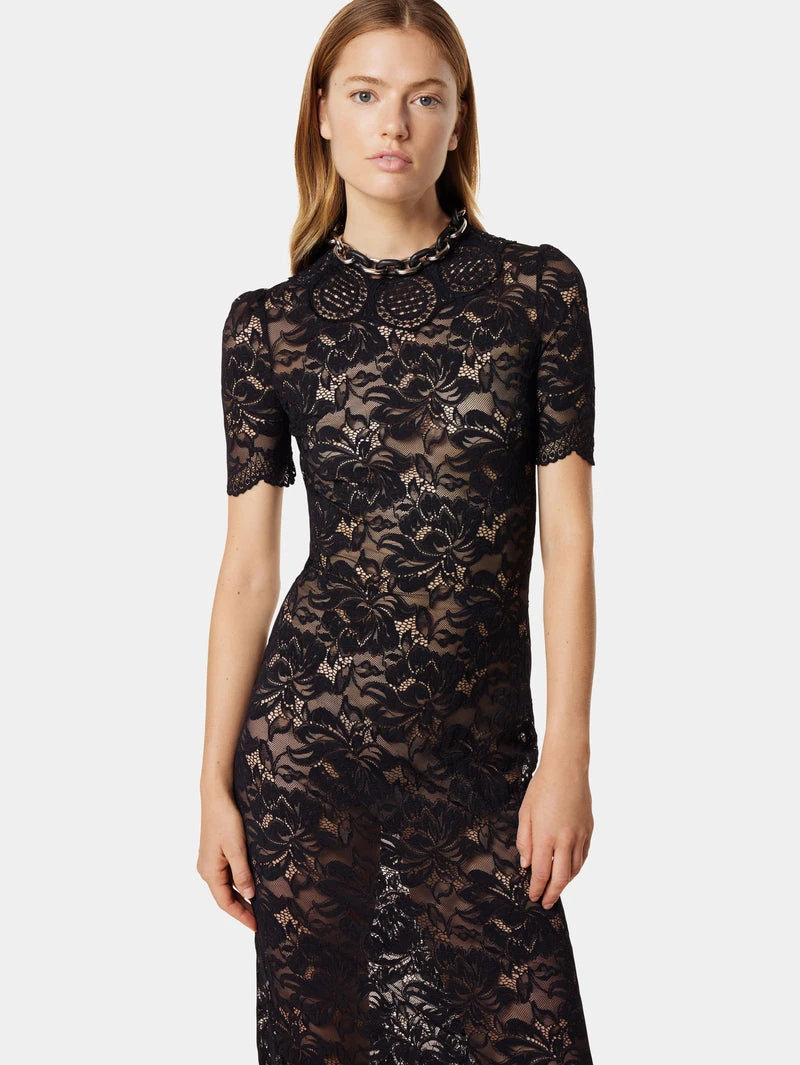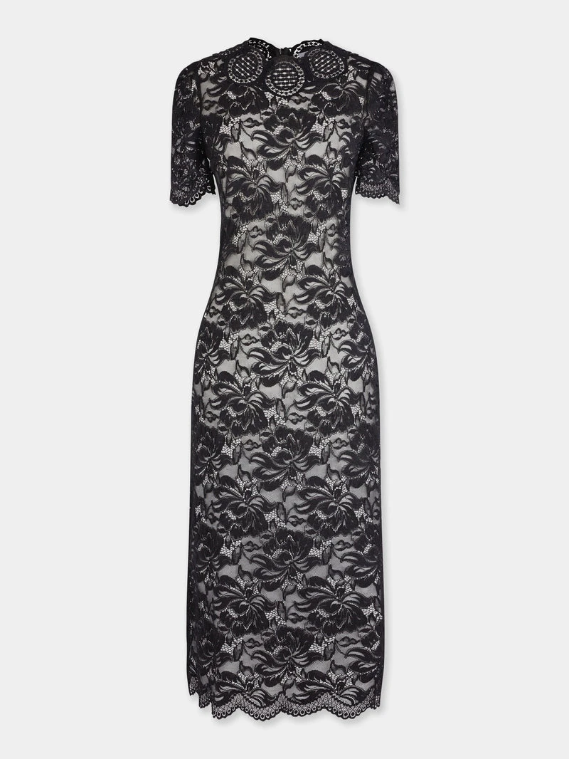 Black stretch-lace long dress Short sleeves Fitted cut Round neck