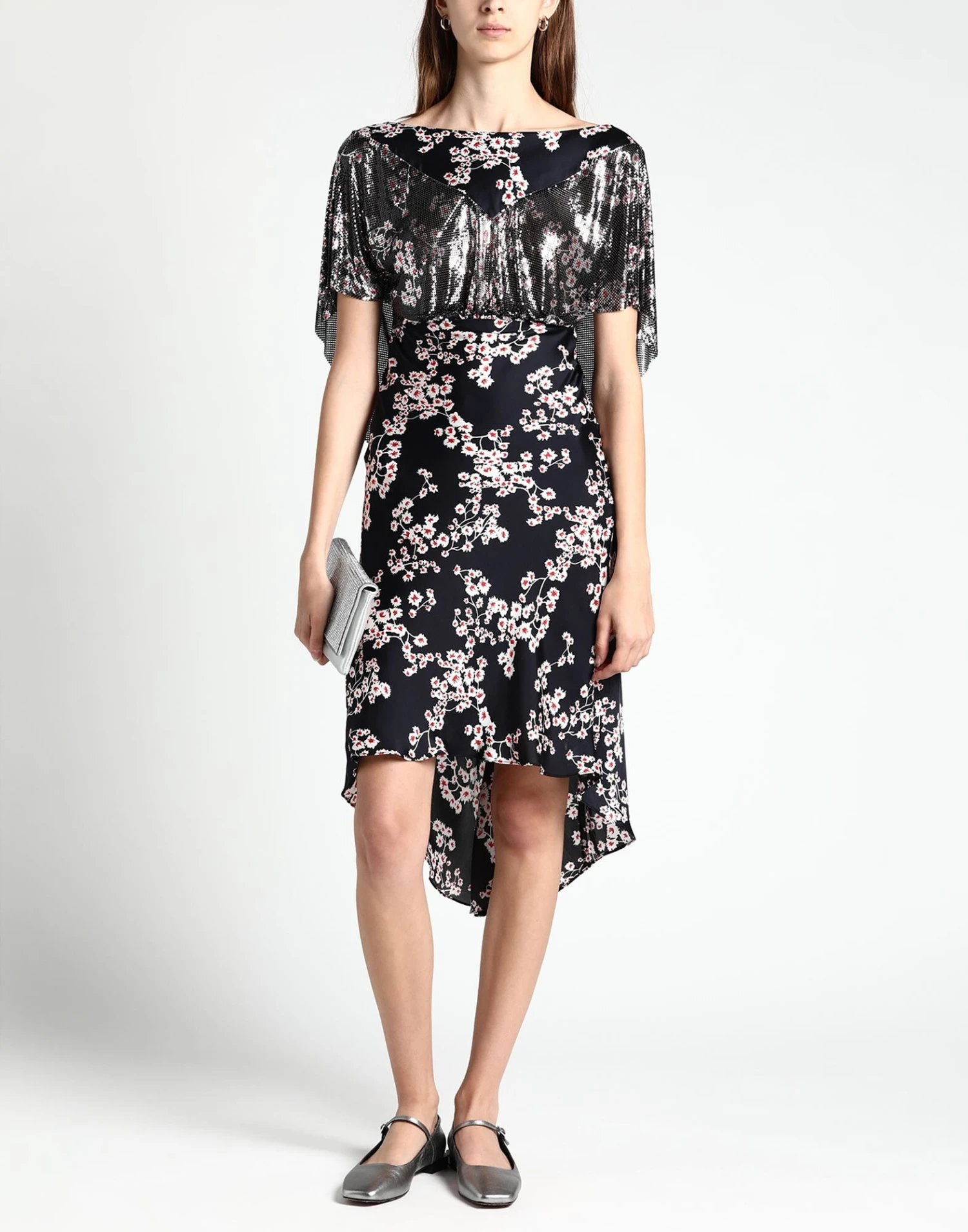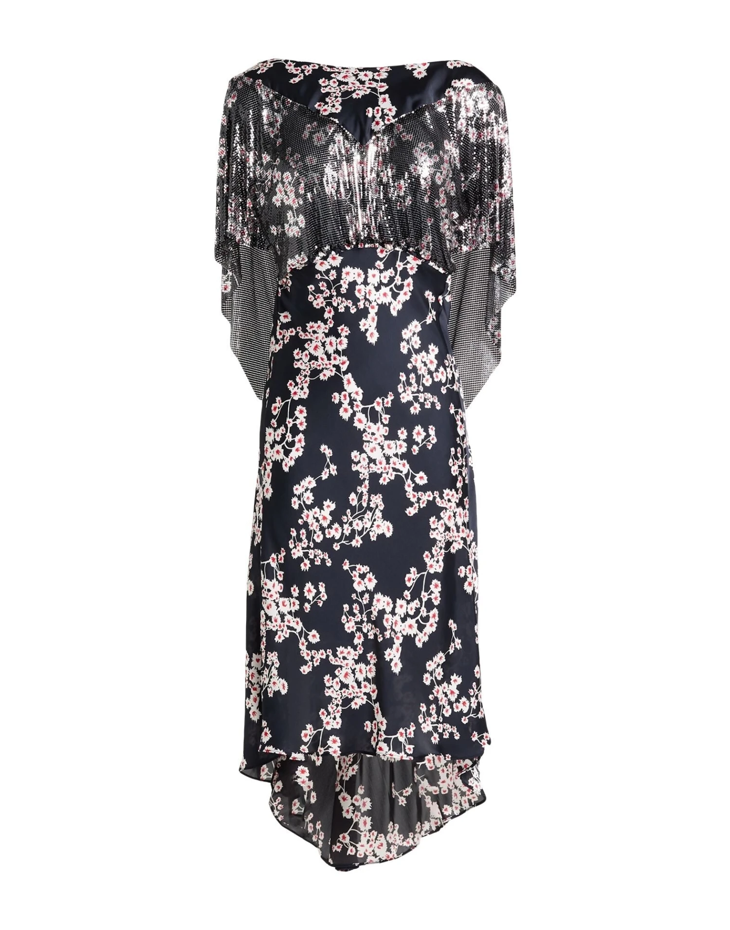 satin, no appliqués, floral design, wide neckline, short sleeves, no pockets, rear closure, hook-and-bar, zip, unlined