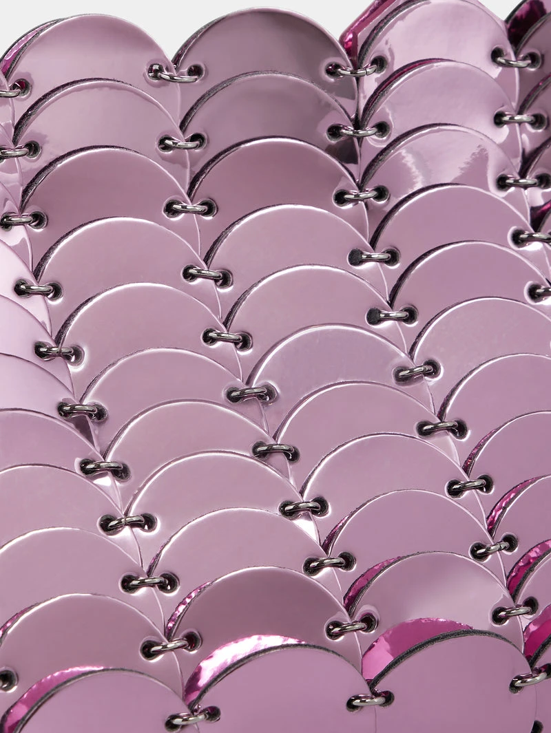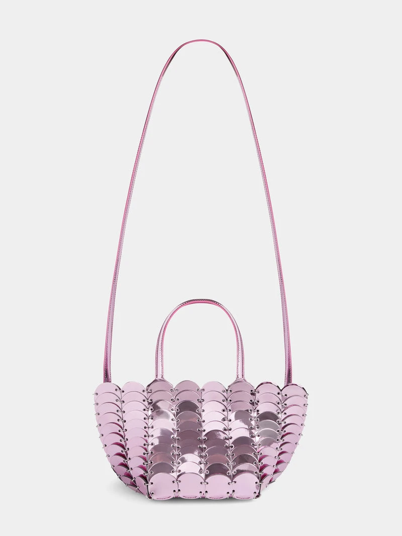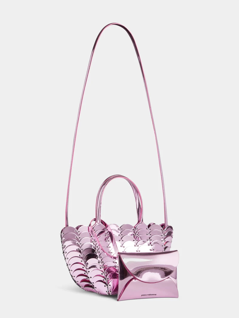 Crafted from Rabanne’s emblematic assembly technique, the Pacoïo creations will complete your outfit with a unique mix of materials. Pink with a mirror effect Can be carried by hand, over the shoulder or crossbody Reinforced and adjustable rounded handle Magnetic closure