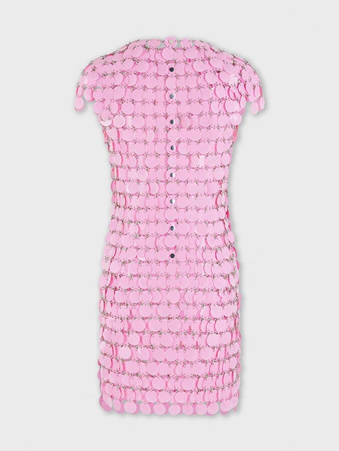 Short dress made from a subtle assembly of pastille and metals, signature of the Rabanne house. Pink color Round collar Short sleeves Fitted cut Press studs on the back