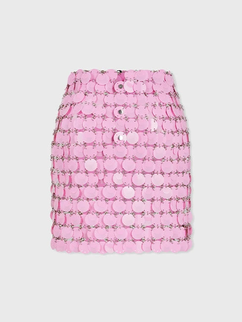 Skirt made from a subtle assembly of pastille and metals, signature of the Rabanne house. Pink color Fitted cut Press studs on the back