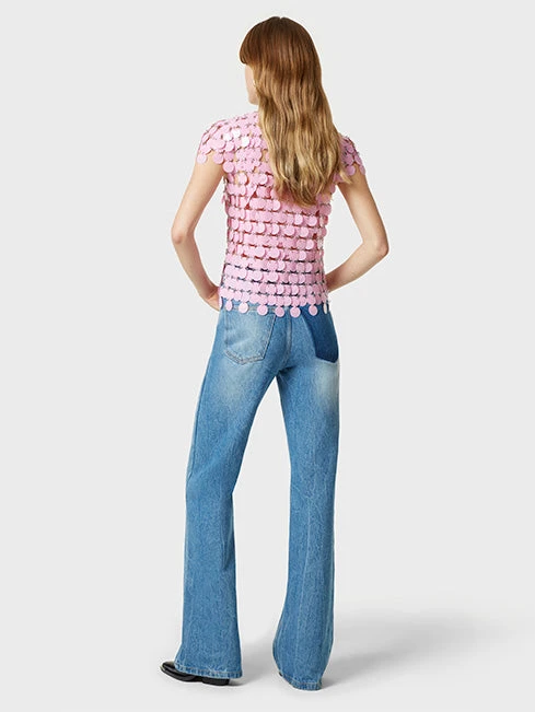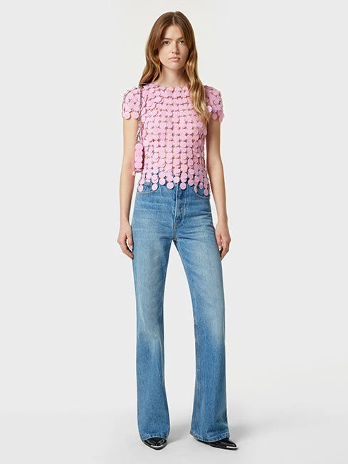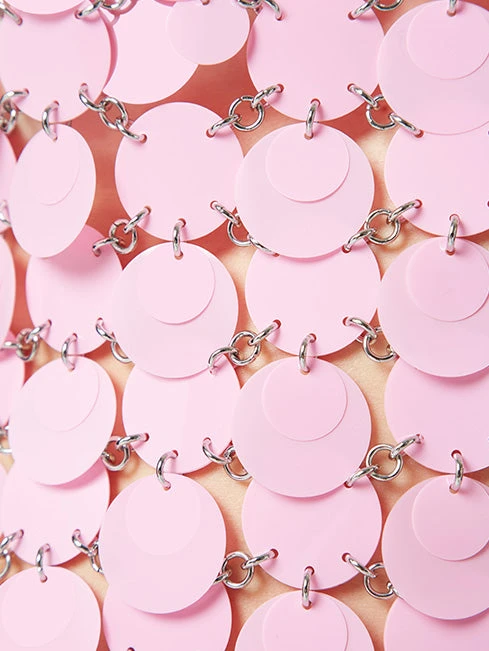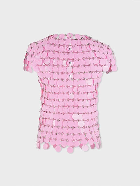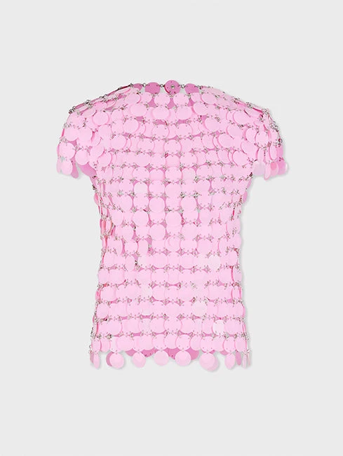 High made from a subtle assembly of pastille and metals, Signature of the Rabanne house. Pink color Round collar Short sleeves Fitted cut Press studs on the back