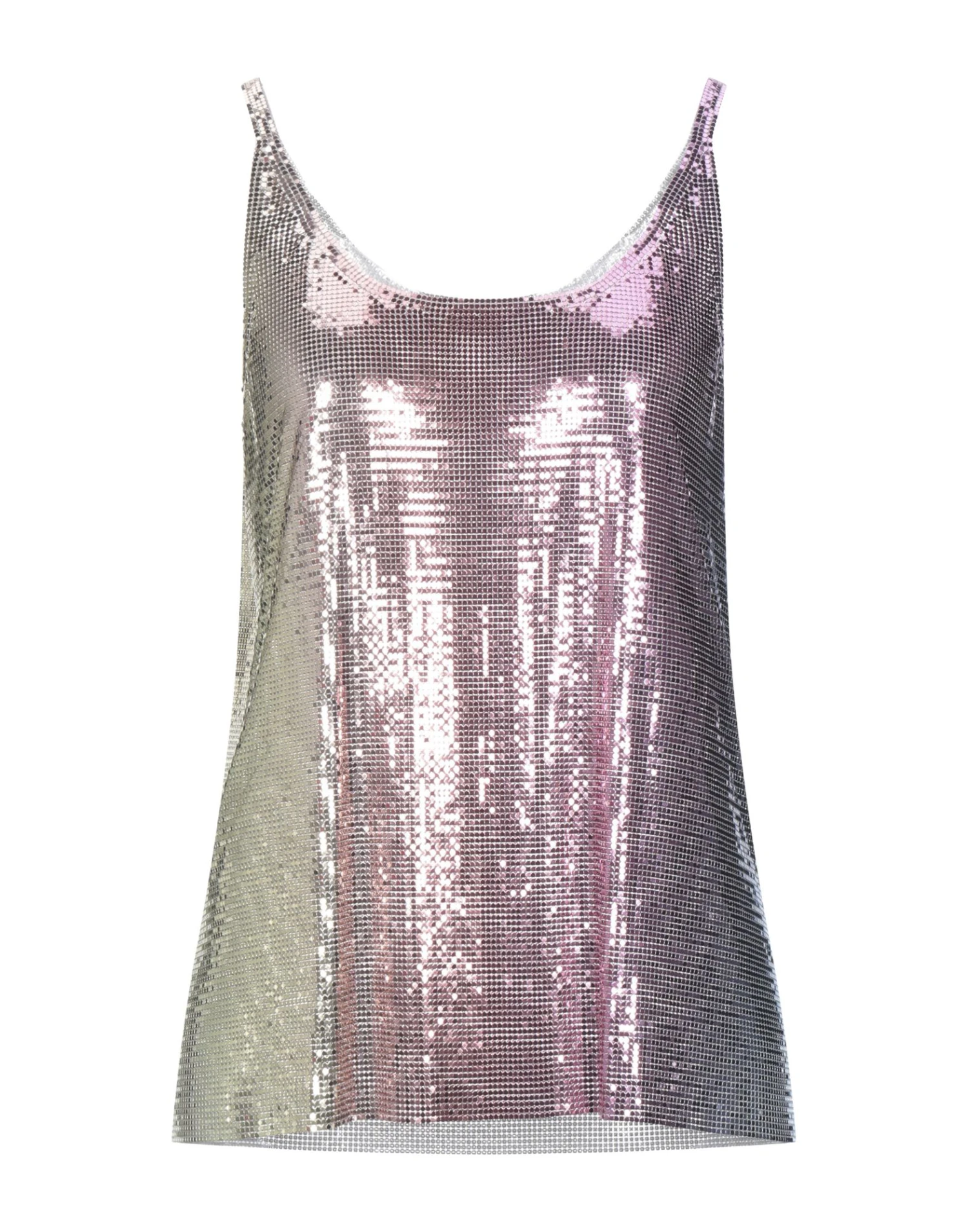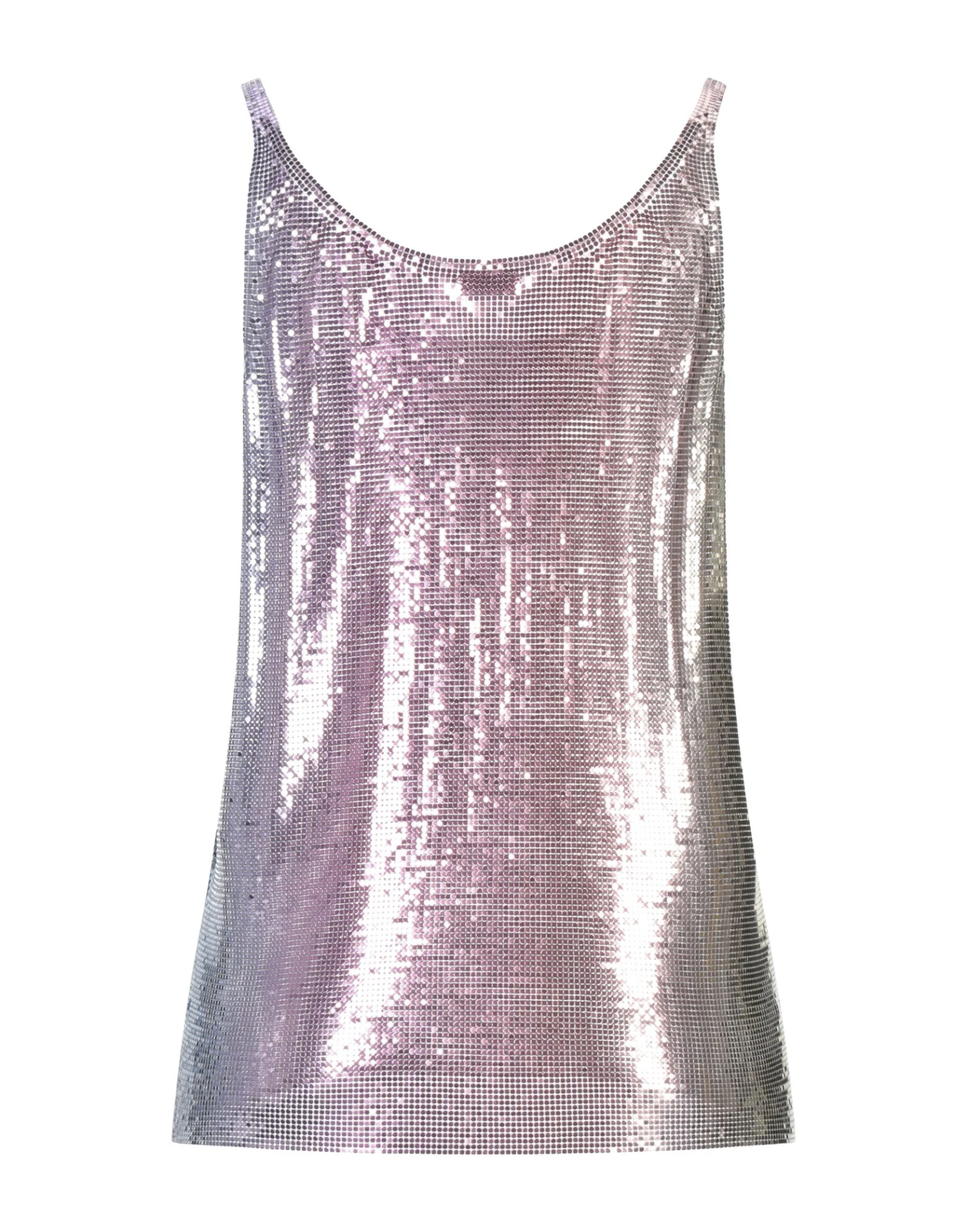 laminated effect, no appliqués, multicolor pattern, wide neckline, sleeveless, no pockets, small sized