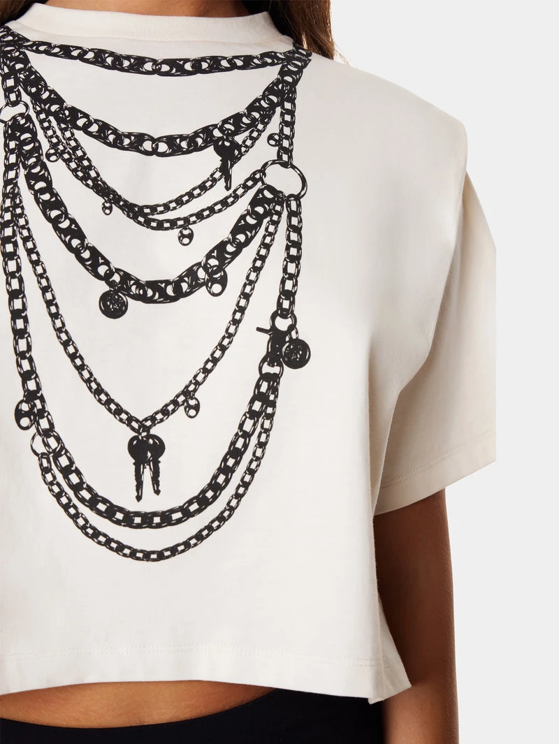 Top with chain and key print Nude color Round neck Short sleeves Relaxed fit