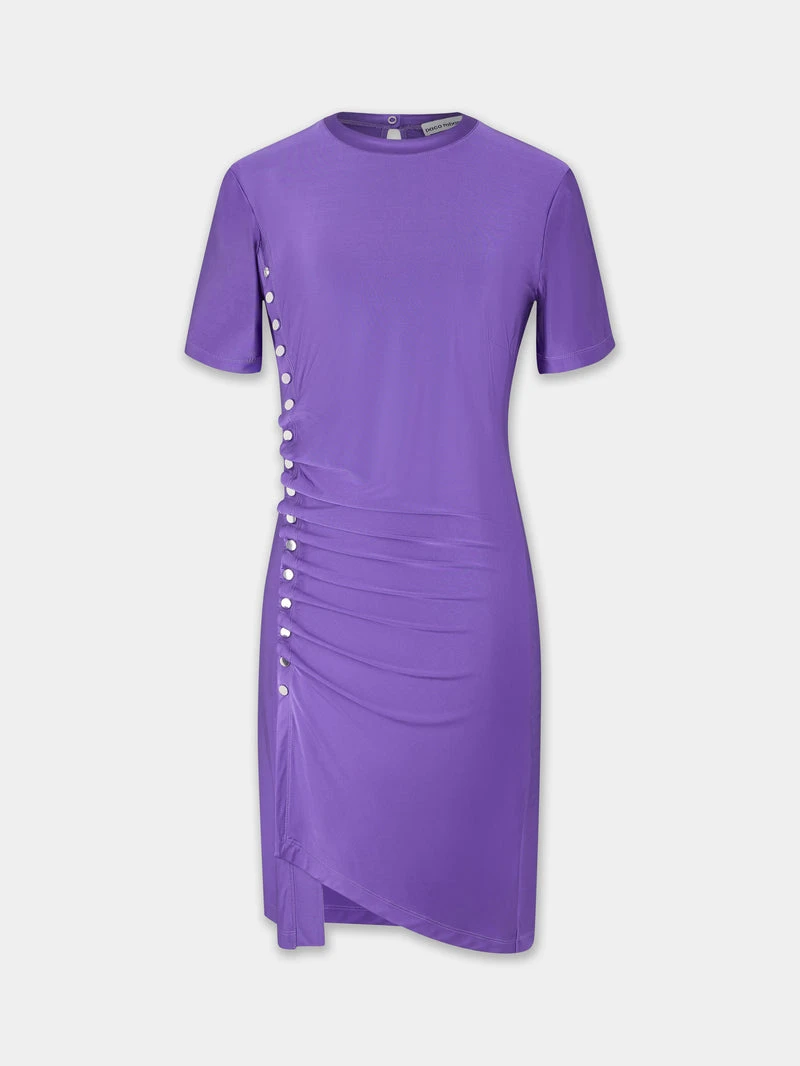 Short pleated dress in stretch jersey Purple Fitted, structured cut Short sleeves Round neck Silver snaps on the side