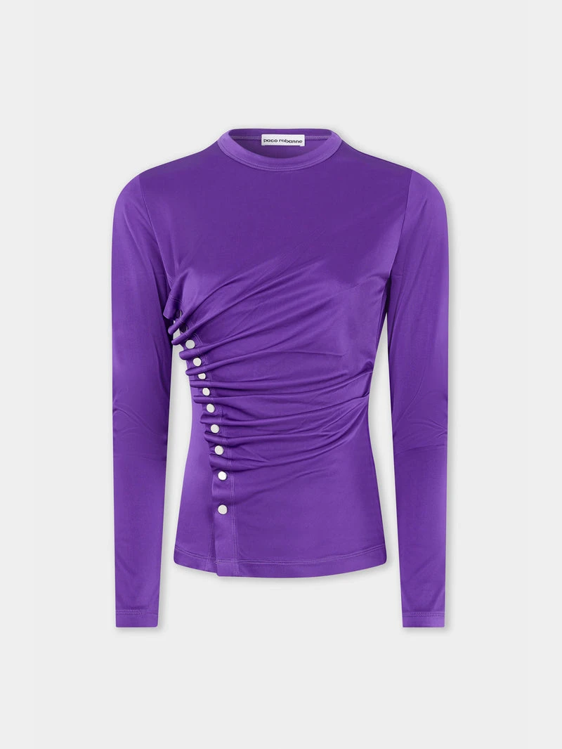 Pleated top in stretch jersey Purple Fitted, structured cut Silver snaps on the side Long sleeves Round neck