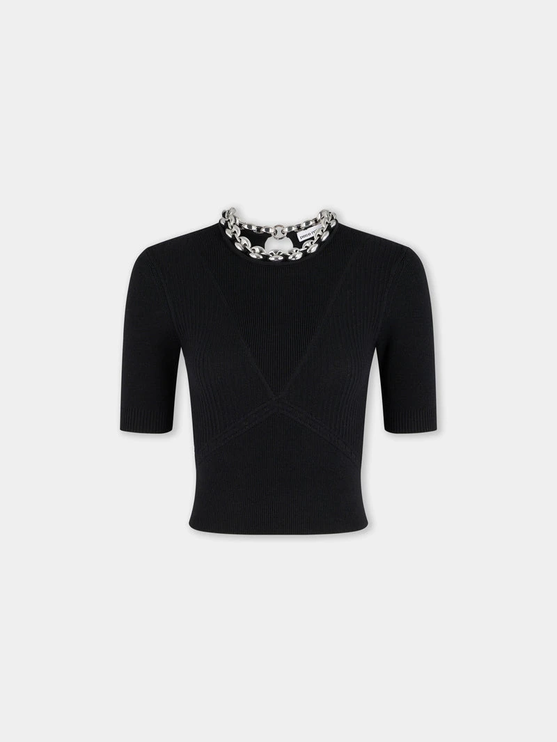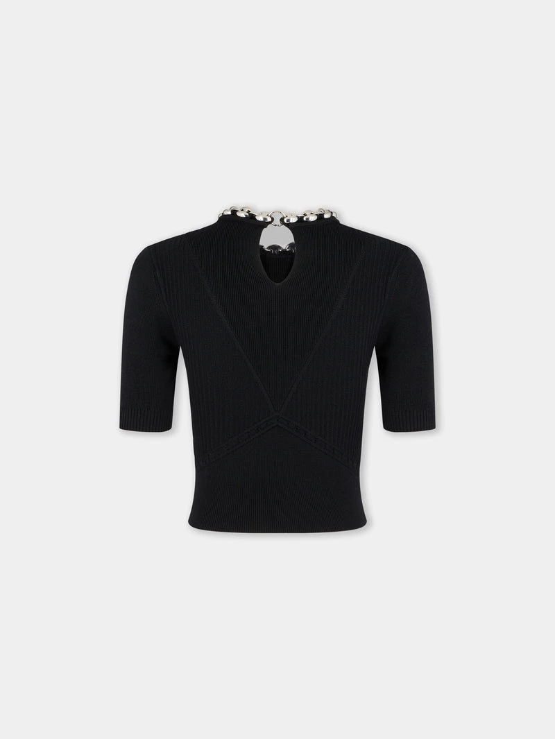 Black wool top Fitted cut Round neck with an assembly of silver-tone “Eight” links 3/4 sleeves