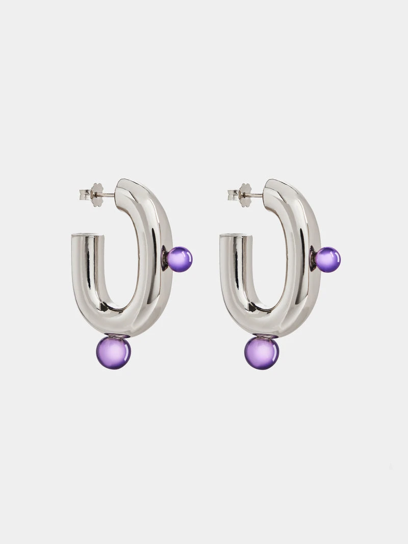 Rabanneās XL Link collection showcases jewelry crafted from large intertwined links with elegantly rounded forms. True symbols of timeless charm, these palladium jewels pay homage to the contemporary vision of their creator. – Silver earrings – Decorated with purple pearls – Shiny finish – T-bar closure with Paco Raban