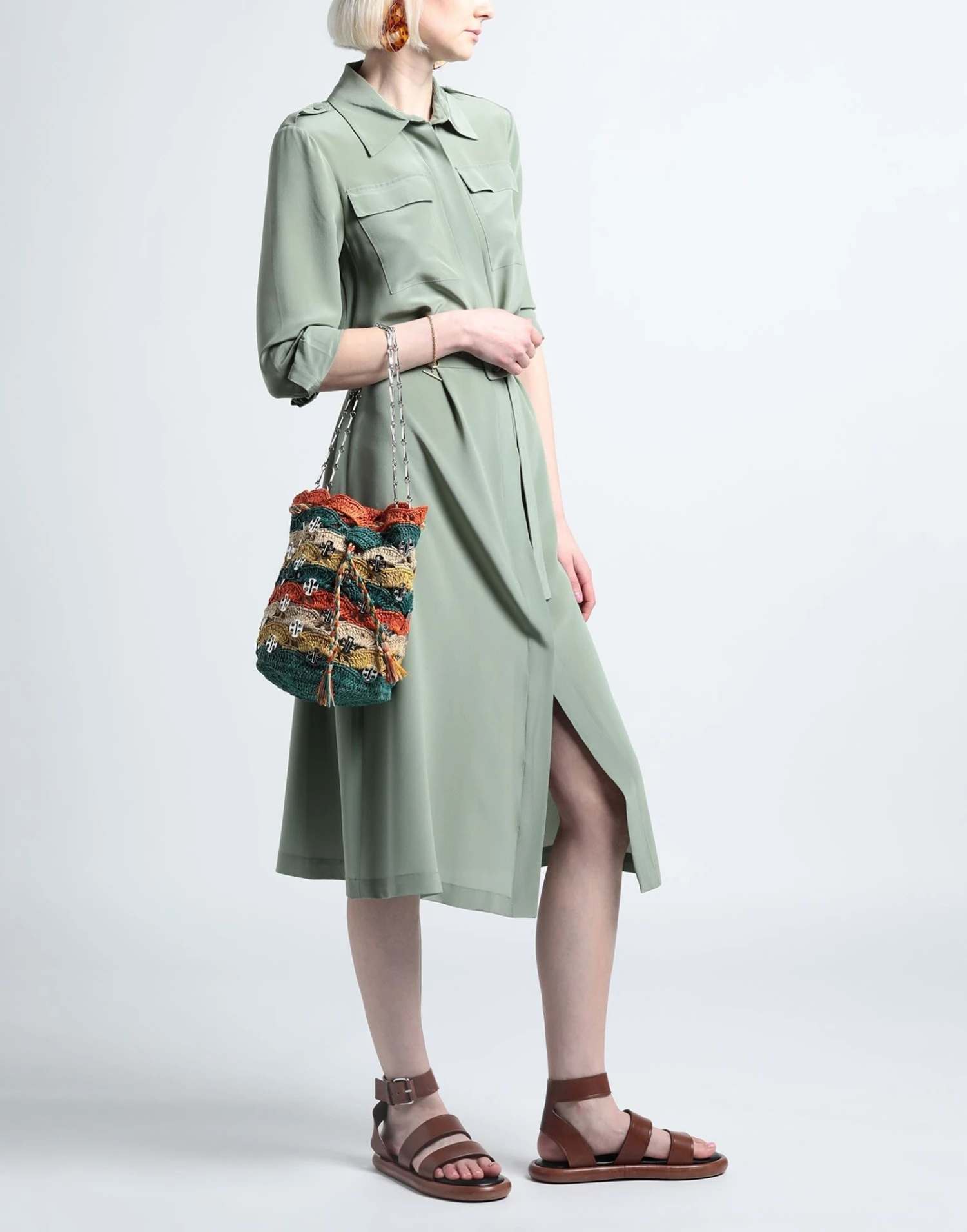 medium, brand logo, metal applications, stripes, unlined, drawstring closure, bag handle, metallic straps, daytime, bucket bag