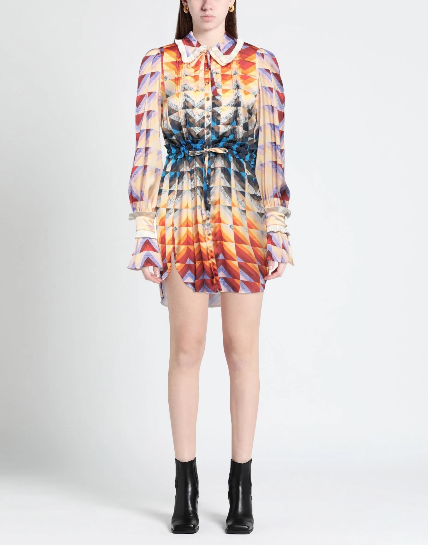 satin, ruffles, multicolor pattern, classic neckline, long sleeves, unlined, button closing, no pockets, side slit hemline, shirt dress