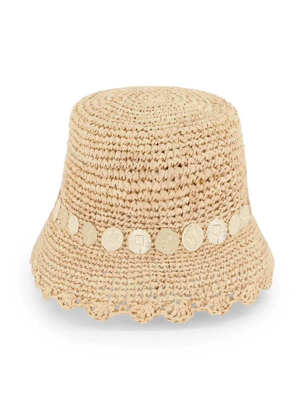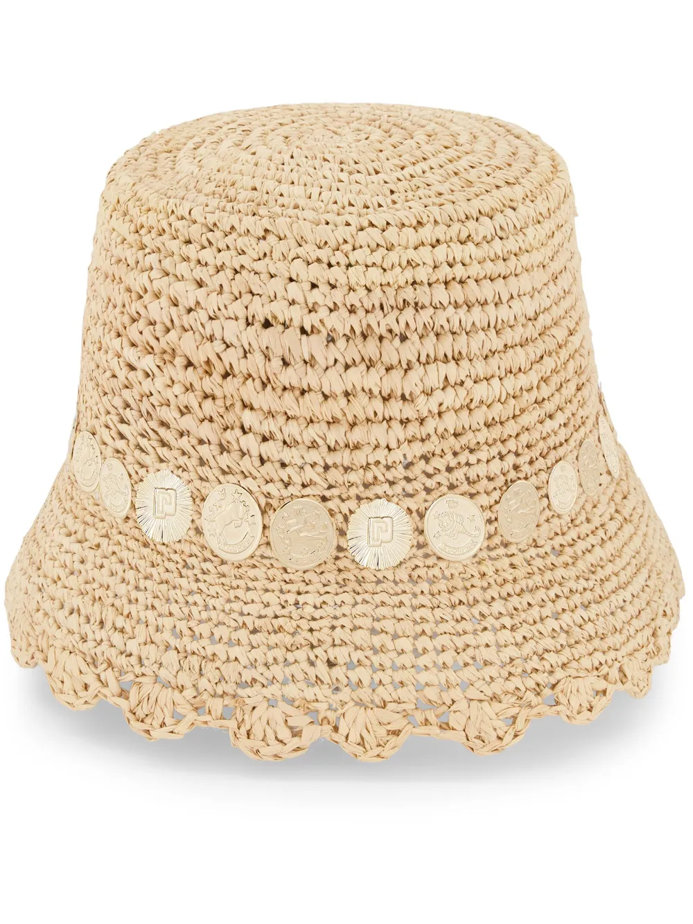 PACO RABANNE infuses this hat with its future-forward aesthetic. Crafted from raffia in a woven design, the accessory is embellished with gold-tone coins engraved with branding motifs for a distinctive finishing touch.