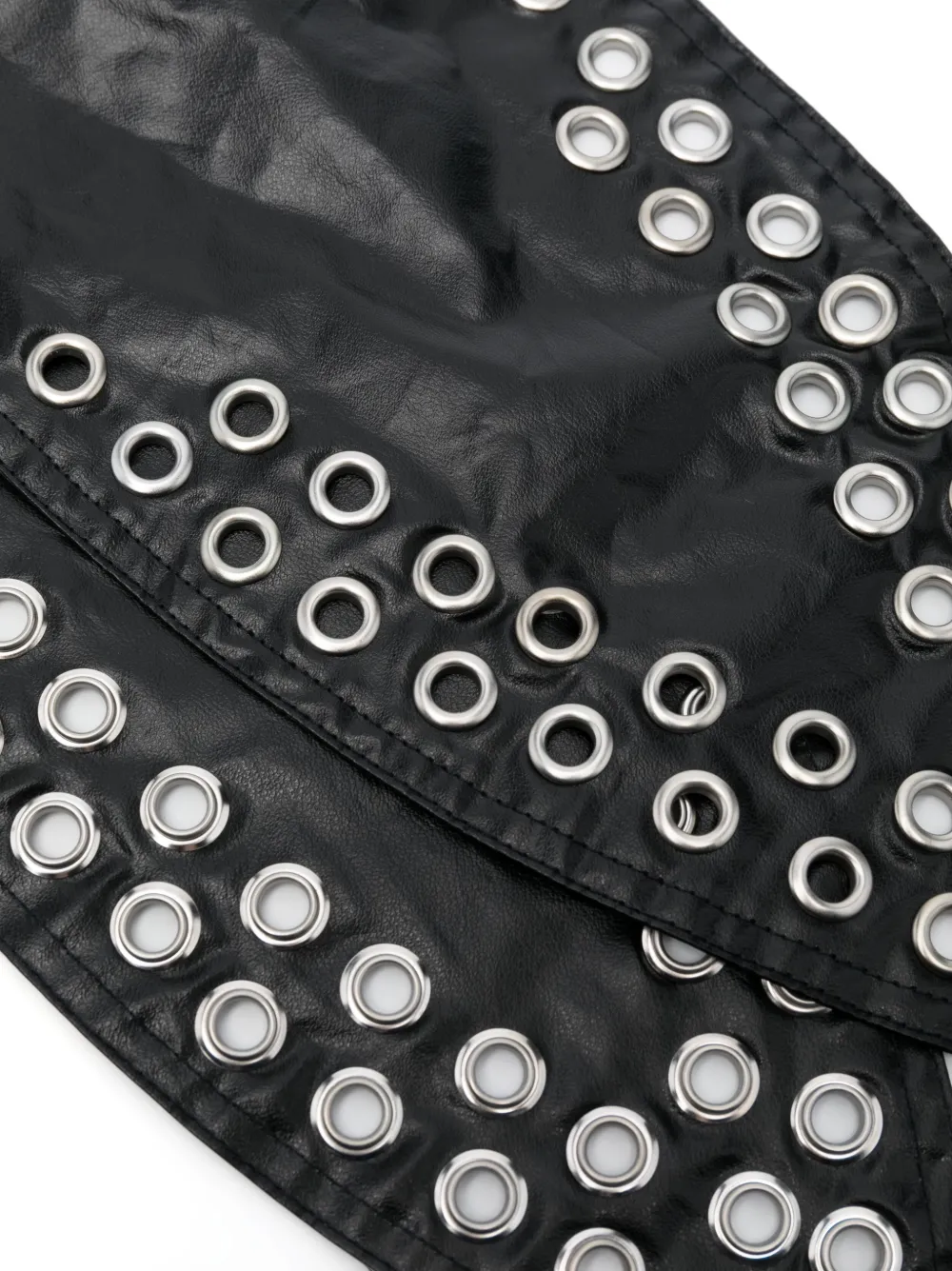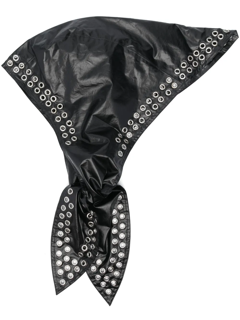 Paco Rabanne continues to exhibit a modern and futuristic approach to design, as demonstrated by this hood from its SS23 collection. Inspired by a ’60s aesthetic, the cotton construction boasts a waxed finish and is decorated with silver-tone studs.