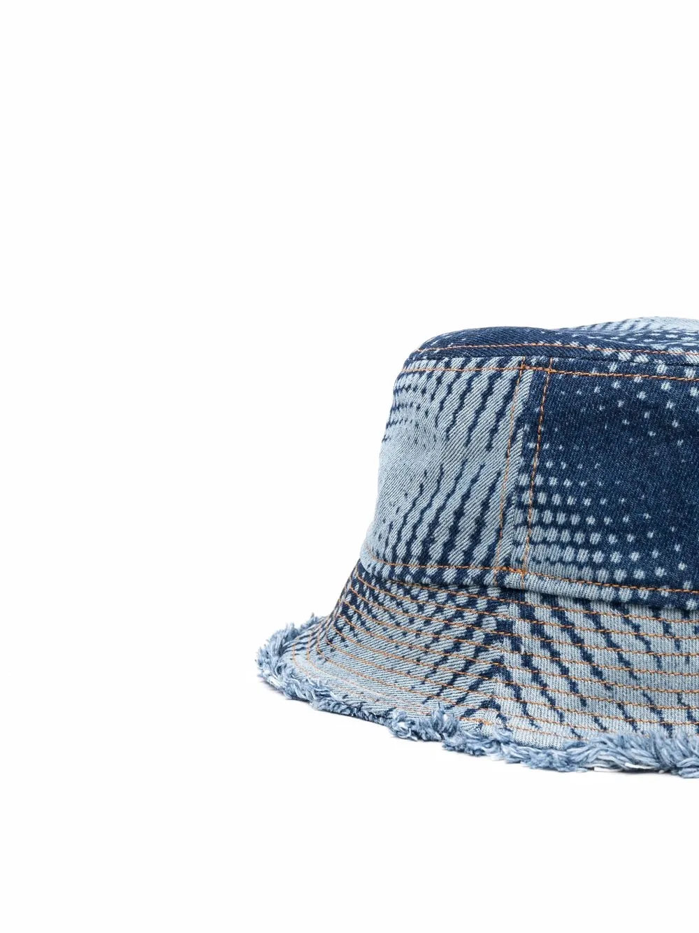Blue/white cotton fringed bucket hat from PACO RABANNE featuring all-over graphic print, fringe detailing, dropped wide brim and pull-on style.