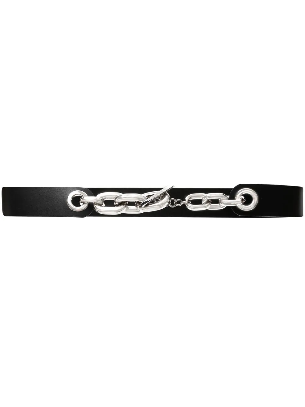 logo chain-link belt from PACO RABANNE featuring 18kt black gold, leather, chain-link trim, engraved logo, silver-tone hardware, T-bar fastening and adjustable fit.