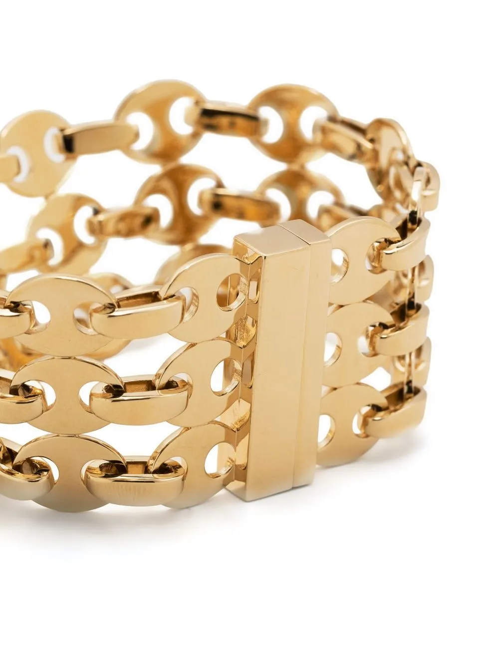 three-row chain-link bracelet from PACO RABANNE featuring gold-tone, brass, chain-link detailing, magnetic fastening and three rows.